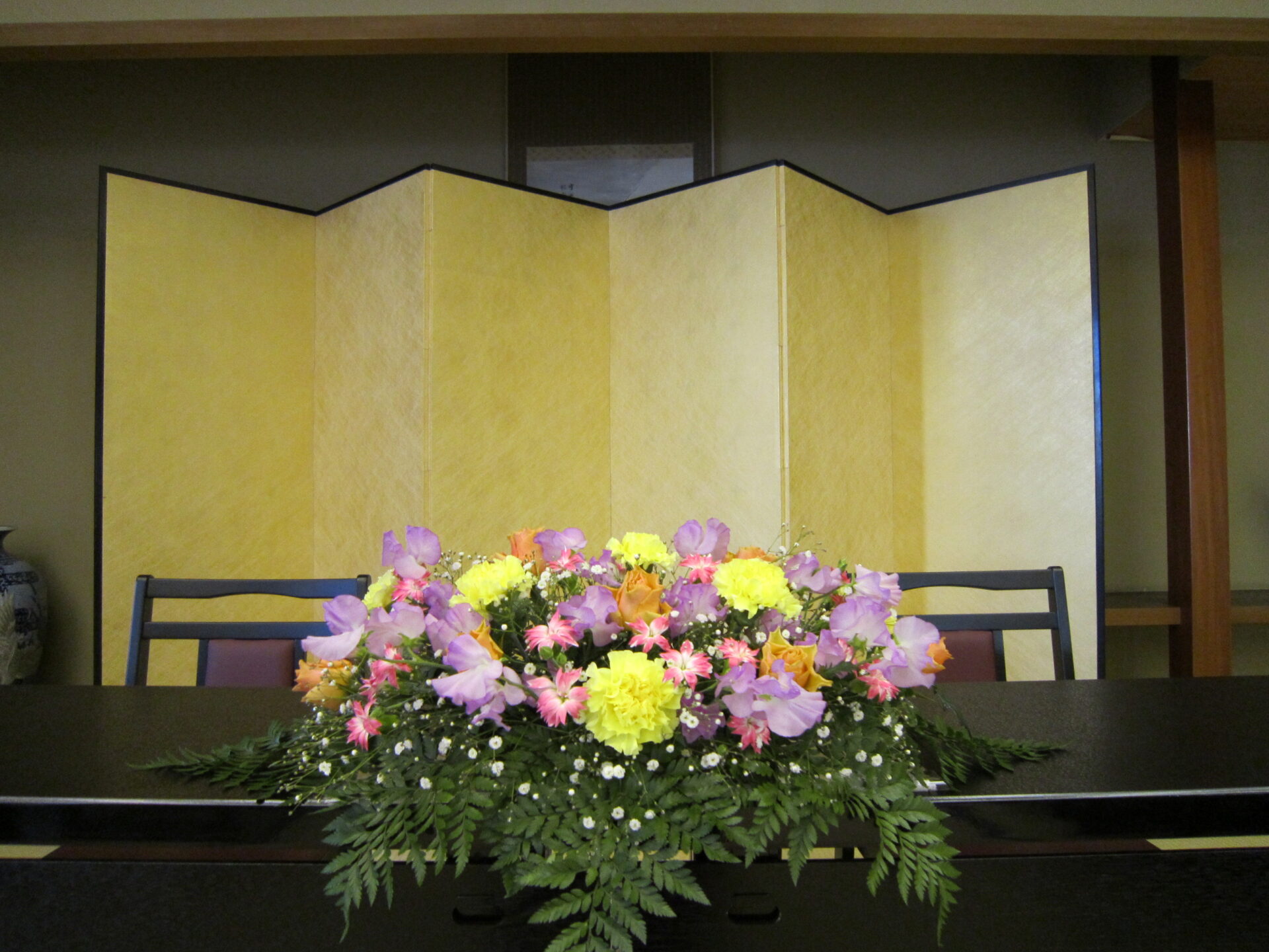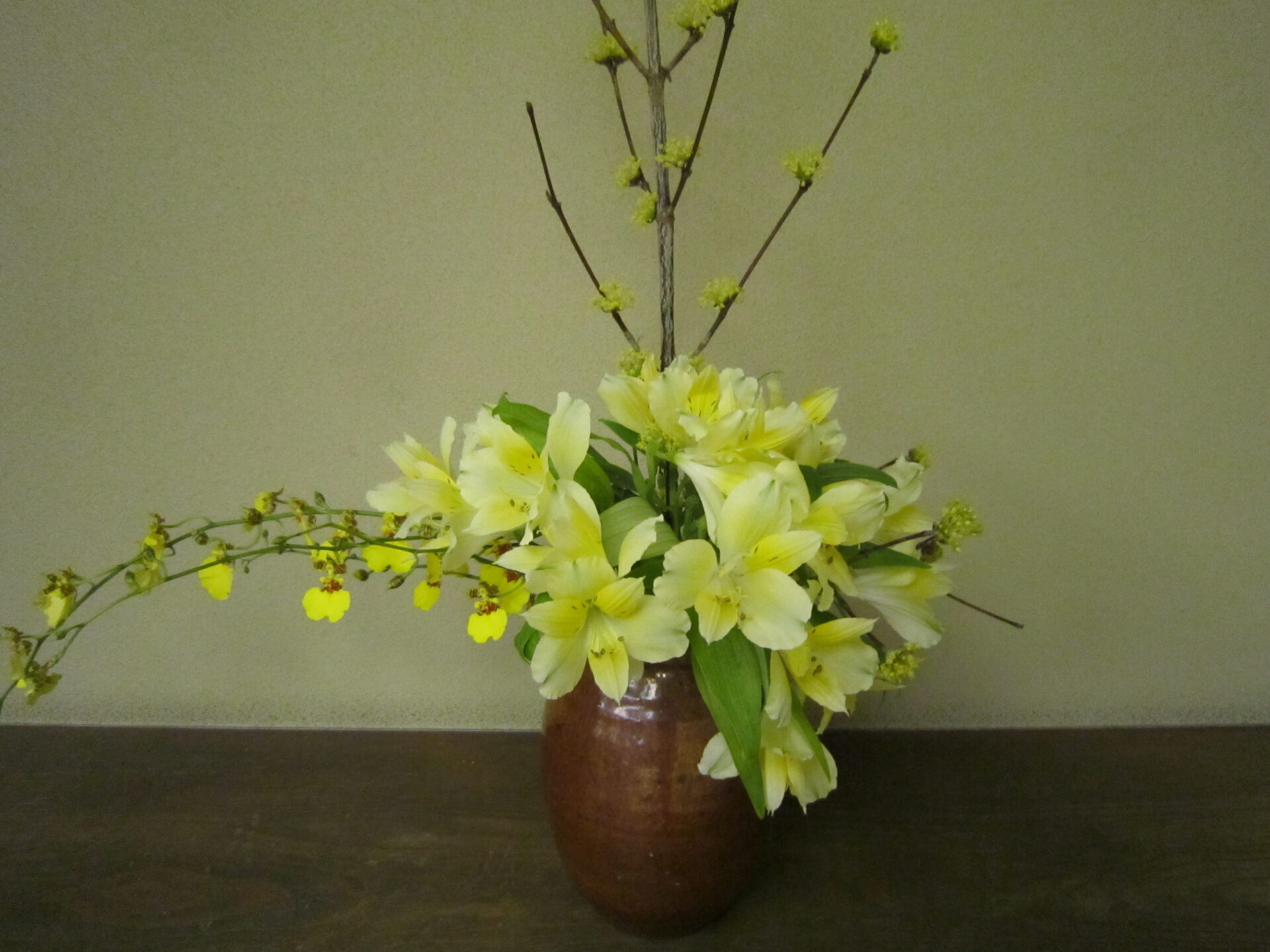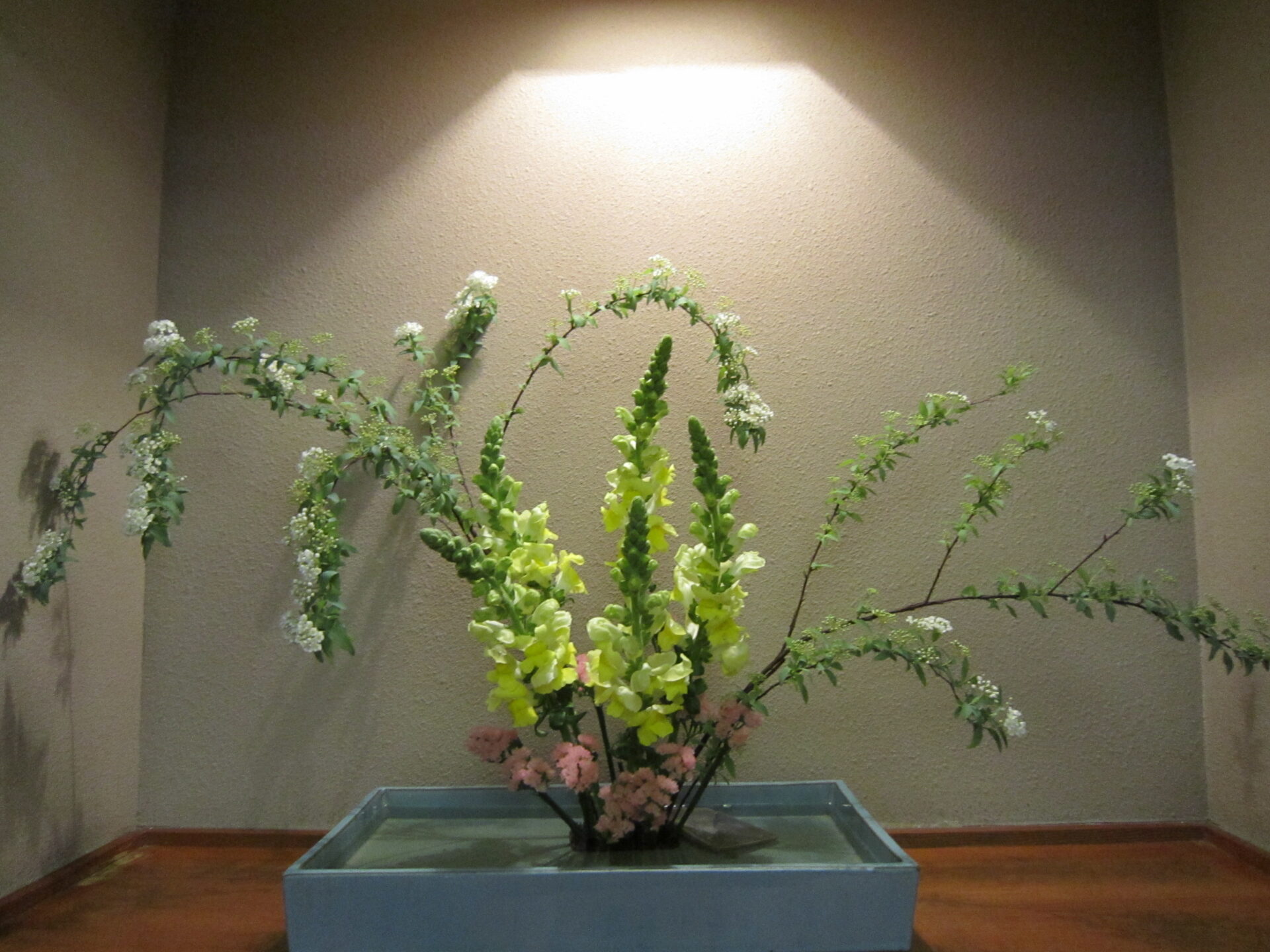 今日の生け花は、小手毬・金魚草・スターチスです。