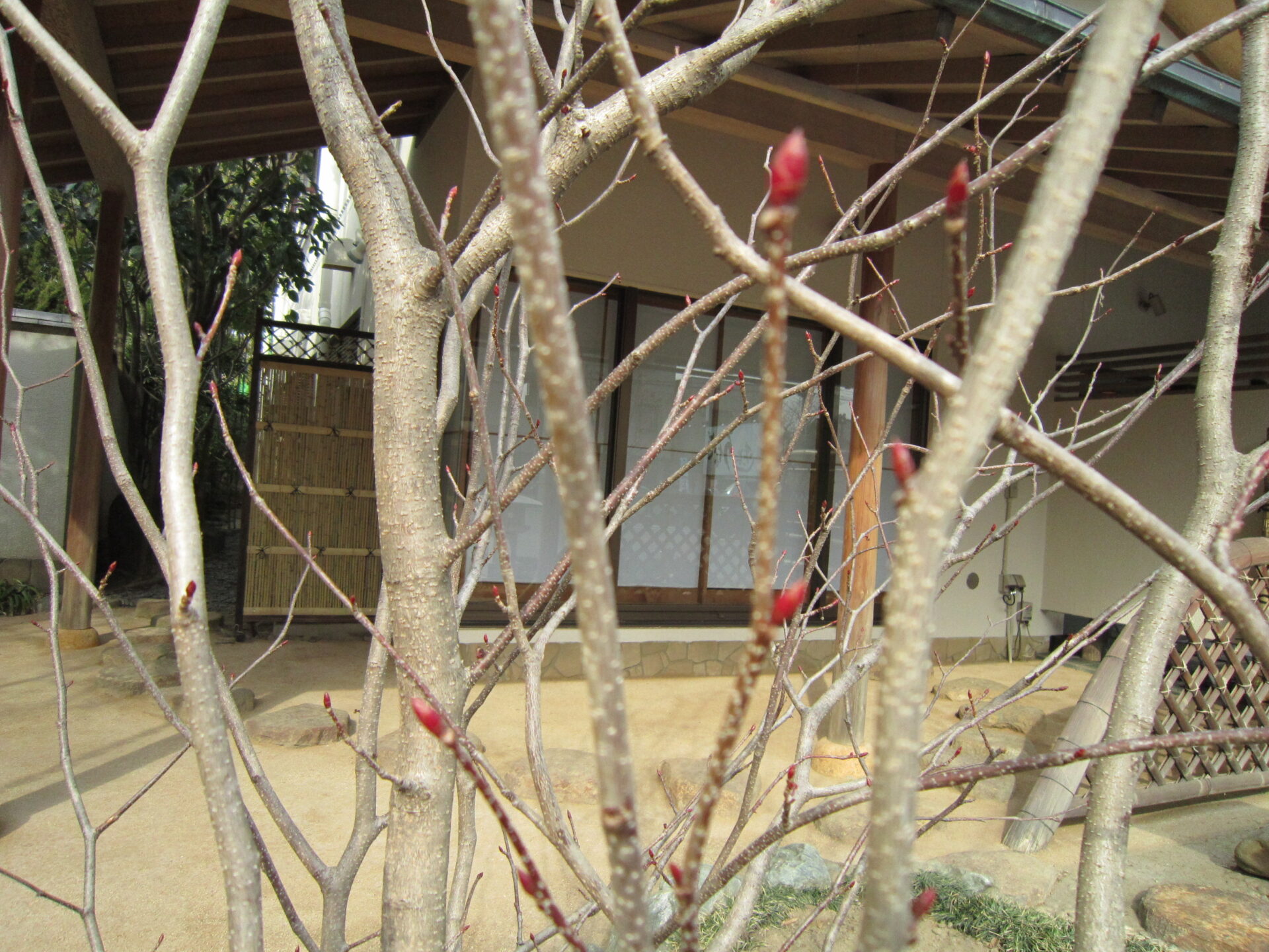 ぽちぽちと赤く、丸葉マンサクの枝に新芽がふくらんできました。