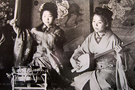 こちらもその中の一枚。島田髪や和服の装いに当時のお座敷の様子を伺うことができます。