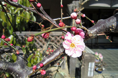 本当に春めいてきました。庭の枝垂れ梅が開花です。